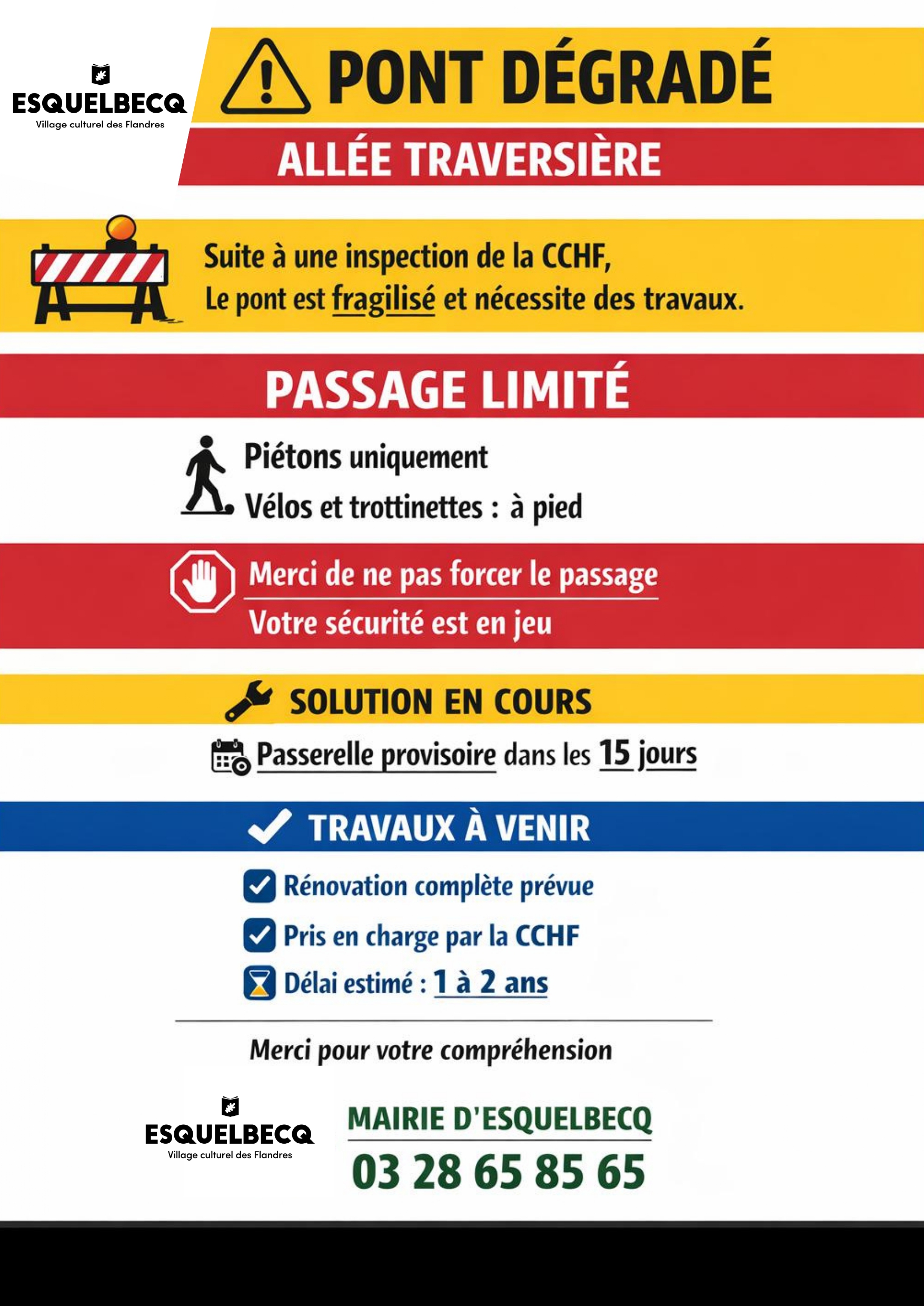 INFO TRAVAUX Suite à une inspection réalisée par la CCHF sur l’ensemble des ponts du territoire, celui de l’allée traversière a été identifié comme dégradé et nécessitant des travaux de rénovation.